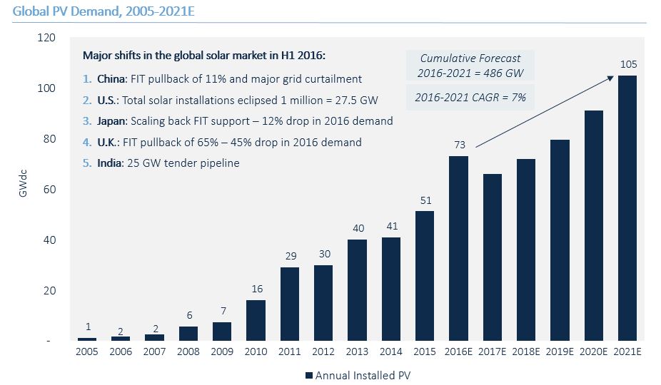 中國(guó)儲(chǔ)能網(wǎng)訊:根據(jù)GTM最新發(fā)布的太陽(yáng)能需求監(jiān)測(cè)報(bào)告來(lái)看,2016年,全球新增太陽(yáng)能裝機(jī)容量將比去年增長(zhǎng)43%,達(dá)到73吉瓦。