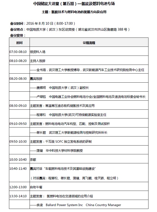 本期氫能及燃料電池大講堂主辦方安排了7個(gè)精彩的主題發(fā)言,并組織了“車載燃料電池技術(shù)及其基礎(chǔ)設(shè)施建設(shè)”和“氫儲(chǔ)能技術(shù)與分布式能源”兩場專業(yè)高端的嘉賓對(duì)話。主辦方代表中國地質(zhì)大學(xué)(武漢)副校長唐輝明教授和中國電器工業(yè)協(xié)會(huì)燃料電池分會(huì)/全國燃料電池及液流電池標(biāo)委會(huì)秘書長盧琛鈺將出席并致辭,中國化學(xué)與物理電源行業(yè)協(xié)會(huì)儲(chǔ)能應(yīng)用分會(huì)秘書長劉勇做總結(jié)發(fā)言。
