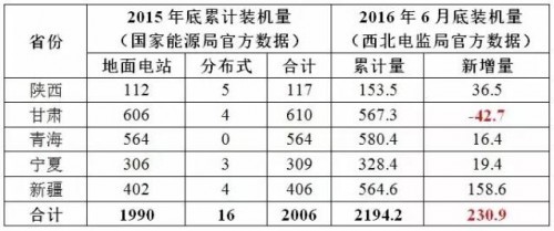 從表2可以看出,截止2016年6月底的累計裝機(jī)容量低于2015年底累計裝機(jī)容量42.7萬kW。如果假設(shè)甘肅新增裝機(jī)量為“0”,則西北五省2016年上半年的新增裝機(jī)量為230.9萬kW,高于其公告中提到的178.7萬kW。