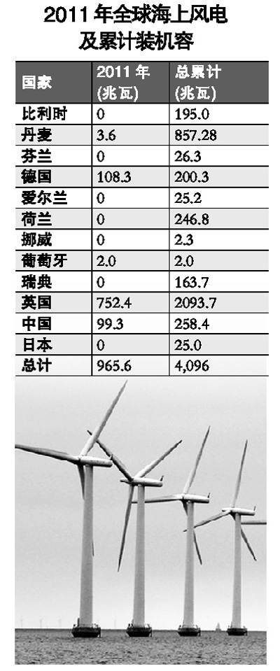 2011年共有235臺(tái)渦輪機(jī)組在九個(gè)風(fēng)電場(chǎng)實(shí)現(xiàn)了并網(wǎng),總?cè)萘窟_(dá)866.4兆瓦,為歐洲累計(jì)輸送了3813兆瓦的海上風(fēng)電。其中,87%的新增容量來自英國海域,德國安裝了108兆瓦,隨后是丹麥3.6兆瓦以及葡萄牙2兆瓦的實(shí)體漂浮式風(fēng)電機(jī)組原型。另有兩個(gè)低端漂浮式風(fēng)電機(jī)組原型在挪威和瑞典進(jìn)行了試驗(yàn)。