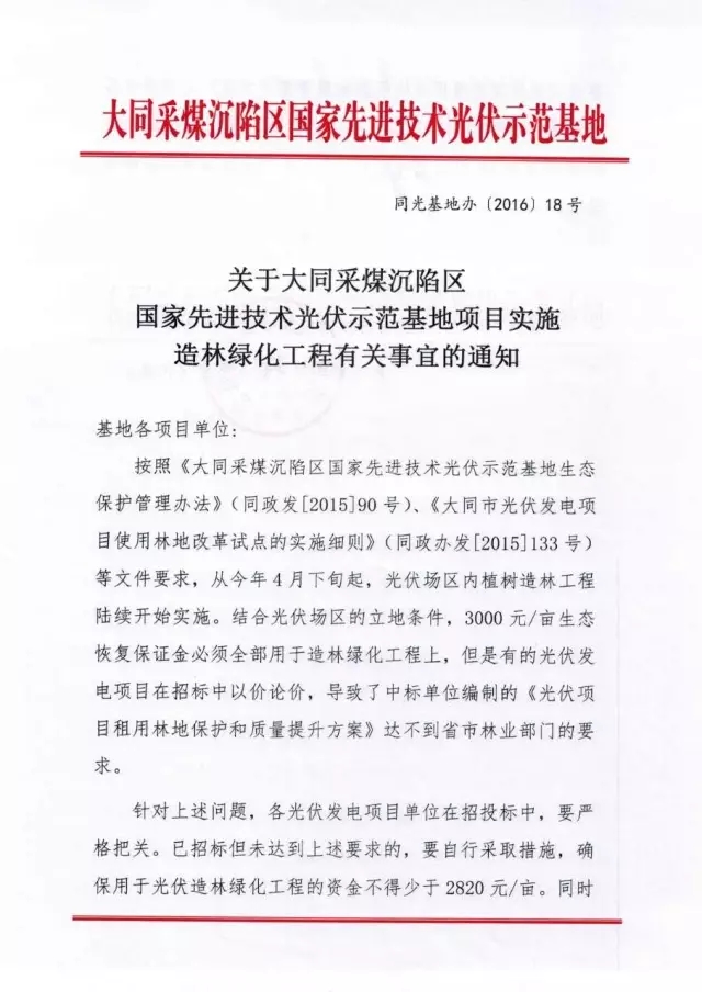 關(guān)于大同采煤沉陷區(qū)國(guó)家先進(jìn)技術(shù)光伏示范基地項(xiàng)目實(shí)施造林綠化工程有關(guān)事宜的通知