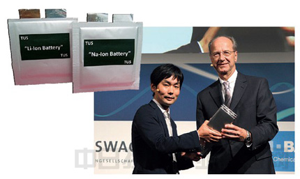 東京理科大學(xué)試制的鈉離子電池(左)與在德國領(lǐng)獎的藪內(nèi)直明(右側(cè)照片左側(cè))