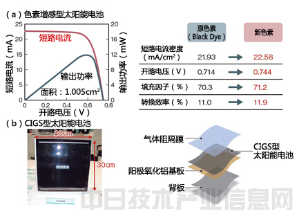 富士膠片面向色素增感型太陽能電池,開發(fā)出提高了轉(zhuǎn)換效率和耐久性的新色素(a)。該公司還利用耐久性出色的氣體阻隔膜試制了柔性CIGS型太陽能電池(b)。