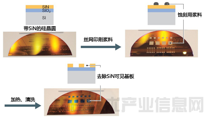 在蝕刻工序中,首先利用絲網(wǎng)印刷工藝在想蝕刻的部位印刷漿料。然后在170℃下加熱5分鐘,這時(shí)漿料就會產(chǎn)生去除SiN的“蝕刻劑”,對漿料下面的SiN進(jìn)行蝕刻。