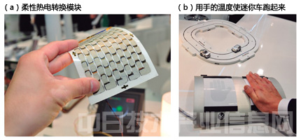 富士膠片開發(fā)出了采用有機(jī)高分子材料的熱電轉(zhuǎn)換模塊(a)。在會場,用手的溫度驅(qū)動了迷你車(b)。計(jì)劃設(shè)置于太陽能電池模塊的背面使用。