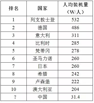 表2:截止2015年底,世界光伏人均裝機量前十名