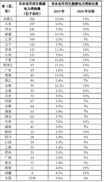 附上2015年各省的非水電可再生能源電力的發(fā)電量和消納比重情況,以及我國到2020年的目標。