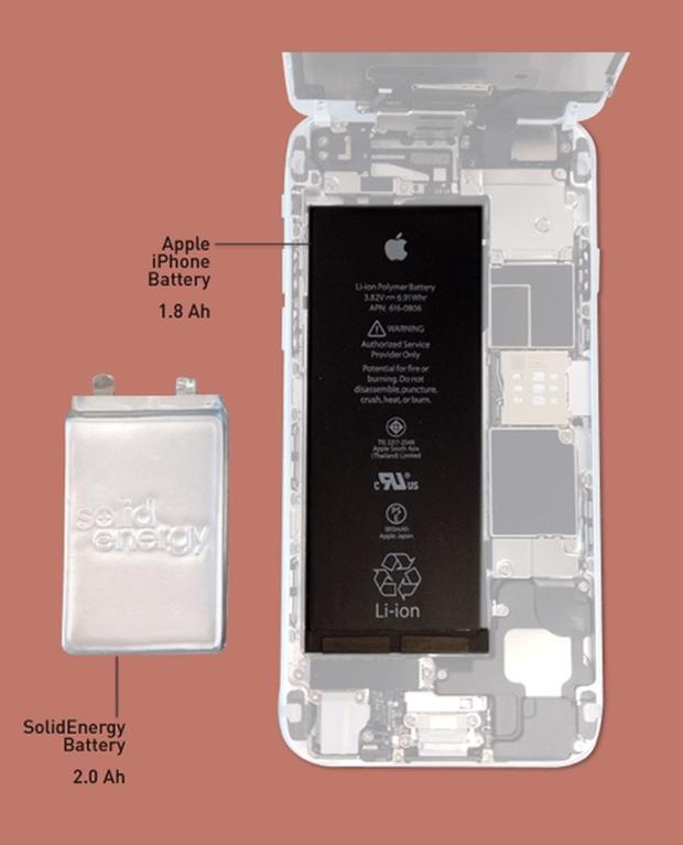 iPhone 6目前使用的就是鋰離子電池,可提供電量為1.8安培小時。而SolidEnergy電池的體積只有前者的一半,電量卻高達2.0安培小時。