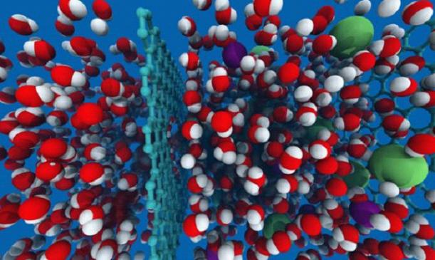 當(dāng)水分子(圖中的紅色和白色)、鈉和氯離子(圖中綠色和紫色)面對(duì)一張石墨烯(圖中心處淡藍(lán)色的),只有適當(dāng)尺寸的粒子能從石墨烯的孔隙穿過(guò),即水能通過(guò),而鹽類的鈉和氯被擋住了。