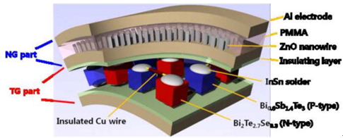 由納米發(fā)電機與熱電發(fā)電機組成的柔性混合能源電池,這種垂直堆疊的混合裝置可用于同時收集熱能和機械能。