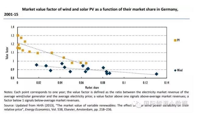 從德國的實(shí)例來看,隨著風(fēng)電光伏占發(fā)電量比例的增加,由于其間歇性為電網(wǎng)帶來的成本增加,其系統(tǒng)價值在下降,尤其是光伏SV下降幅度更大。