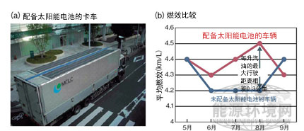 三家公司在卡車(chē)上實(shí)際配備1.2千瓦太陽(yáng)能電池模塊進(jìn)行實(shí)證實(shí)驗(yàn)的結(jié)果顯示,1個(gè)月的平均燃效最多可改善0.3公里/升。準(zhǔn)備了款式及出產(chǎn)年份相同的卡車(chē),對(duì)進(jìn)行實(shí)際運(yùn)營(yíng)時(shí)的燃效進(jìn)行了比較。結(jié)果顯示,通過(guò)配備太陽(yáng)能電池,可將休息及等貨等怠速停止5分鐘以上的時(shí)間,削減50%左右,有助于改善燃效。