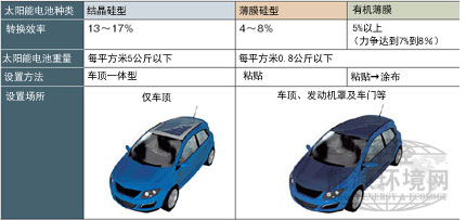 豐田汽車(chē)公司于2009年5月上市的“普銳斯”就是在私家車(chē)上配備太陽(yáng)能電池的例子。在車(chē)頂配備了外形尺寸約為1065毫米×600毫米、最大輸出功率為56瓦的結(jié)晶硅型太陽(yáng)能電池模塊。