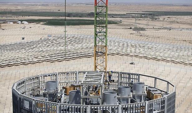 中國儲能網訊:裝機121MW的Ashalim1塔式光熱電站位于以色列在內蓋夫(Negev)沙漠,這座塔式光熱電站總占地面積為3.15平方公里,場地中央矗立著Ashalim塔,高240米——是世界上最高的集熱塔,塔底將安裝約5.5萬面鏡子,占地面積約400個足球場大小,這一浩大的工程構成了沙漠中的一幅奇景。