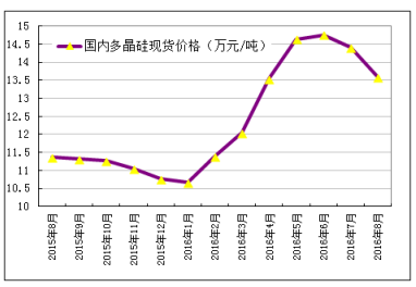 圖1 2015年8月-2016年8月國(guó)內(nèi)多晶硅現(xiàn)貨報(bào)價(jià) 單位:萬(wàn)元/噸 來(lái)源:硅業(yè)分會(huì)