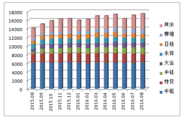圖2 2015年8月-2016年8月國(guó)內(nèi)多晶硅分企業(yè)產(chǎn)量圖 單位:噸 來(lái)源:硅業(yè)分會(huì)