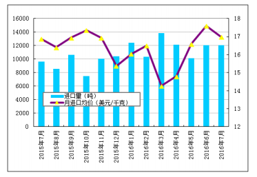 圖3 2015年7月-2016年7月多晶硅進(jìn)口量及進(jìn)口均價(jià)示意圖 數(shù)據(jù)來(lái)源:海關(guān)