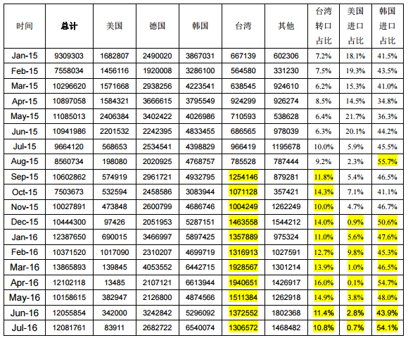 根據(jù)海關(guān)最新數(shù)據(jù)統(tǒng)計(jì),2016年7月份我國(guó)多晶硅進(jìn)口量依舊維持在萬(wàn)噸以上,達(dá)到12082噸,環(huán)比增加0.22%,同比大幅增加25.0%。2016年截止7月份,七個(gè)月單月進(jìn)口量均在萬(wàn)噸以上,其中有五個(gè)月單月進(jìn)口量都超過(guò)1.2萬(wàn)噸,1-7月份累計(jì)進(jìn)口多晶硅83016噸,同比增加19.0%。導(dǎo)致多晶硅進(jìn)口量持續(xù)維持在萬(wàn)噸以上的原因主要是:第一,從韓國(guó)進(jìn)口量居高不下。7月份從韓國(guó)進(jìn)口量達(dá)到6540噸,環(huán)比增加23.5%,同比大幅增加48.7%,比前七個(gè)月月均進(jìn)口量高出13.4%,僅次于4月份的歷史最高位6614噸,占到7月份總進(jìn)口量的54.1%,一半以上的進(jìn)口量來(lái)自韓國(guó)進(jìn)口,主要是因?yàn)橹袊?guó)對(duì)韓國(guó)多晶硅反傾銷裁決只是象征性的2.4-2.8%稅率。第二,從臺(tái)灣進(jìn)口多晶硅占比維持高位。7月份從臺(tái)灣進(jìn)口多晶硅為1307噸,占進(jìn)口總量的10.8%。“暫停加工貿(mào)易措施”嚴(yán)格執(zhí)行的9月份開(kāi)始,從臺(tái)灣進(jìn)口多晶硅量驟然增加至千噸以上,占比達(dá)到10%以上,成為我國(guó)除韓國(guó)和德國(guó)外的第三大進(jìn)口地區(qū)一直持續(xù)至今,尤其是4月份從臺(tái)灣進(jìn)口量達(dá)到1941噸,創(chuàng)歷史新高,占總進(jìn)口量的16.0%。臺(tái)灣地區(qū)不生產(chǎn)多晶硅,主要是受“雙反”影響的美國(guó)多晶硅通過(guò)臺(tái)灣規(guī)避。第三,其他地區(qū)月進(jìn)口量日漸增加。7月份從韓、臺(tái)、德、美以外的地區(qū)進(jìn)口量達(dá)到1468噸,來(lái)自日本、馬來(lái)西亞、挪威以及沙特的進(jìn)口量均在200噸以上,尤其是從馬來(lái)西亞進(jìn)口量7月份達(dá)到796噸,占總進(jìn)口量的6.6%。綜上,自韓國(guó)、臺(tái)灣進(jìn)口量長(zhǎng)期維持高位,其他地區(qū)進(jìn)口量日漸增加是導(dǎo)致總進(jìn)口量居高不下的主要因素。