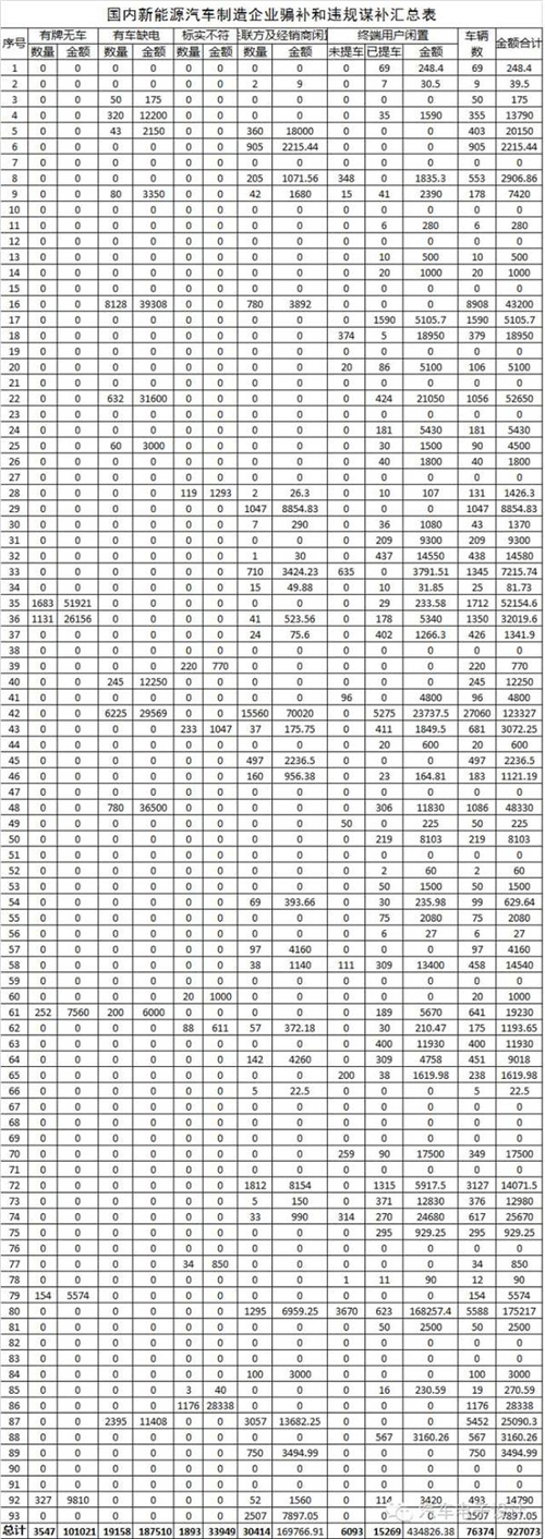而在9月8日下午和晚間,一份未經(jīng)證實(shí)的“騙補(bǔ)名單”中,更多主流車企名列其中,它們被曝光都有不同程度的騙補(bǔ)和違規(guī)套取補(bǔ)貼行為——少到30多萬(wàn),多到5個(gè)億,93家被調(diào)查企業(yè)中僅21家沒(méi)有騙補(bǔ)和違規(guī)套取補(bǔ)貼行為。這種規(guī)模的騙補(bǔ)一旦被官方證實(shí),顯然超出了任何一位專家或行業(yè)人士的設(shè)想。