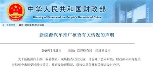 5月28日,財(cái)政部官網(wǎng)表示關(guān)于新能源汽車推廣騙補(bǔ)的現(xiàn)場(chǎng)核查已經(jīng)完成,進(jìn)入會(huì)審階段。