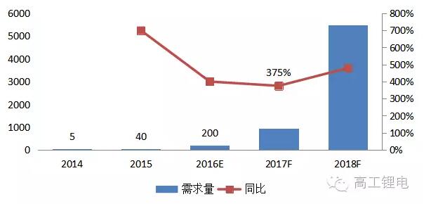 2015年以前中國三元NCA材料處于研發(fā)建設時期,市場尚未形成銷量,總體需求量百噸以內(nèi)。2016年開始隨著電芯廠技術(shù)不斷進步,大企業(yè)的研發(fā)投入加大,對NCA材料需求將不斷增多,GGII預測未來三年NCA材料市場需求將呈現(xiàn)逐步倍增趨勢。