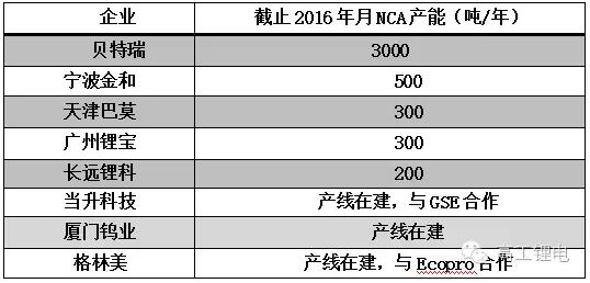 圖表1 2016年中國NCA材料企業(yè)的進展分析
