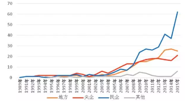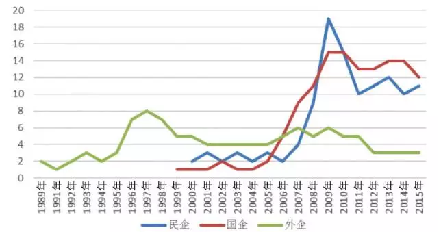 風(fēng)電開發(fā)企業(yè)主要為中國企業(yè),外商投資企業(yè)進(jìn)入中國市場非常有限。在國企中,主要分布有中央直屬企業(yè)和地方國企。從風(fēng)電開發(fā)企業(yè)數(shù)量變化看,2004年以前,不足10家企業(yè),從2005年起逐年增長,到2013年超過80家,其中央企17家,地方國企26家,民企41家(國企和民企均超過40家,在此期間,國企的數(shù)量一直比民企多);到2015年,企業(yè)數(shù)量共計(jì)超過100家企業(yè),民企數(shù)量突破60家,超過國企,央企和地方國企數(shù)量與2013年相比變化不大。