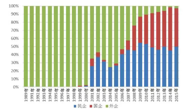 從風(fēng)電制造企業(yè)歷年新增裝機(jī)容量看,2000年之前,外企獨(dú)占整個(gè)中國風(fēng)電市場。2001年起中國風(fēng)電市場格局發(fā)生改變,中國企業(yè)勢力開始增強(qiáng),市場占有率達(dá)到35.4%(民企25.9%,國企9.5%),外企下降到64.6%。但2003年至2004年,中國企業(yè)出現(xiàn)萎縮,2004年占有率下降到不足25%,且?guī)缀跞縼碜悦衿螅馄笫袌稣加新蔬_(dá)到75%。2005年,隨著中國企業(yè)數(shù)量的增加,市場占有率也在逐年攀升,尤其國企增長明顯,從圖2可以看出,外企的市場份額逐漸被國企吞噬。2014年中國企業(yè)市場占有率達(dá)到歷史高點(diǎn)98.3%(民企45.3%,國企53%),外企1.7%。