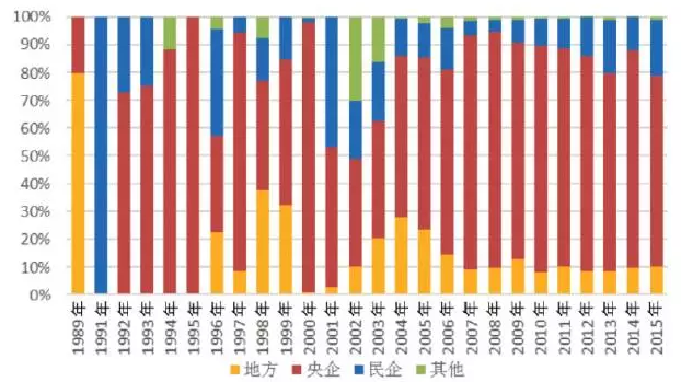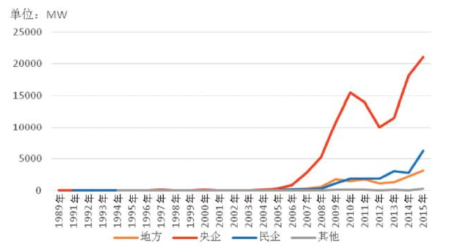 從歷年新增裝機(jī)的市場占有率看,從2005年到2015年,國企的市場占有率均超過80%,在2008年最高達(dá)到95%,之后又回落在80%至90%之間,其中,央企的市場占有率達(dá)到70%至80%之間,而地方國企僅占10%左右。從2009年至2015年,民企市場占有率整體趨勢顯示增強(qiáng),尤其在2013年和2014年,民企市場占有率達(dá)到20%左右。