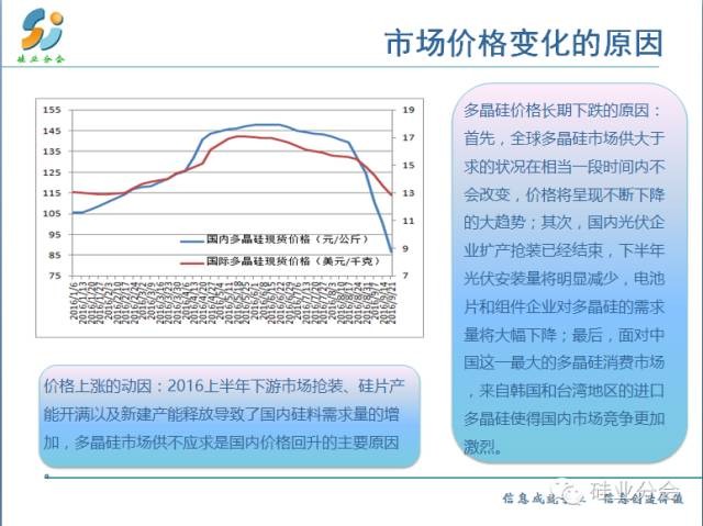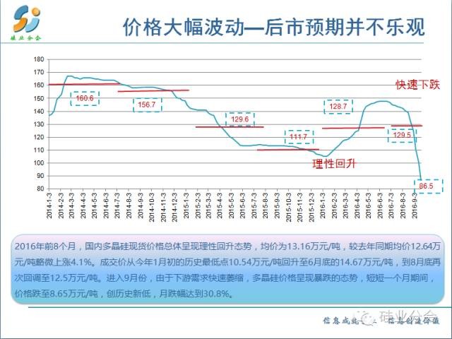 2016年前8個(gè)月,國內(nèi)多晶硅現(xiàn)貨價(jià)格總體呈現(xiàn)理性回升態(tài)勢,上半年均價(jià)為13.16萬元/噸,較去年同期均價(jià)12.64萬元/噸略微上漲4.1%。成交價(jià)從今年1月初的歷史最低點(diǎn)10.54萬元/噸回升至6月底的14.67萬元/噸,而到8月底再次回調(diào)至12.5萬元/噸。2016上半年下游硅片產(chǎn)能開滿以及新建產(chǎn)能釋放導(dǎo)致國內(nèi)硅料需求量的增加、多晶硅市場供不應(yīng)求是國內(nèi)價(jià)格回升的主要原因。雖然上半年多晶硅企業(yè)面臨的困境有所緩解,但這一短暫的價(jià)格回升已基本結(jié)束并在需求銳減的情況下,市場價(jià)格出現(xiàn)斷崖式快速下跌,8月份最后兩周時(shí)間內(nèi)價(jià)格下降了10%左右。(到昨天多晶硅價(jià)格又下降了﹪)。對此,我們對今年下半年和2017年國內(nèi)多晶硅產(chǎn)業(yè)狀況預(yù)期并不樂觀。首先,全球多晶硅市場供大于求的狀況在相當(dāng)一段時(shí)間內(nèi)不會(huì)改變;其次,國內(nèi)光伏企業(yè)擴(kuò)產(chǎn)搶裝已經(jīng)基本結(jié)束,下半年光伏安裝量將明顯減少,電池片和組件企業(yè)對多晶硅的需求量將大幅下降;最后,以韓國企業(yè)為代表的國外多晶硅廠商幾乎沒有自己的本土市場,面對中國這一最大的多晶硅消費(fèi)市場(占全球總消費(fèi)量的78%—81.6%)來自韓國和臺灣地區(qū)的進(jìn)口多晶硅使得國內(nèi)市場競爭更加激烈,這對于多晶硅價(jià)格維持在合理水平極為不利。