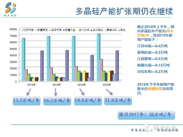 2016上半年,受光伏“搶裝”的影響,國內(nèi)多晶硅市場需求旺盛,一線企業(yè)幾乎都在滿負(fù)荷運(yùn)行,部分停產(chǎn)檢修企業(yè)也恢復(fù)了生產(chǎn)。截止2016年8月底,國內(nèi)多晶硅企業(yè)17家(含1家檢修),有效產(chǎn)能為20.6萬噸/年(新增產(chǎn)能包括:江蘇中能4000噸/年、亞洲硅業(yè)3000噸/年、江西賽維5000噸/年、昆明冶研3000噸/年等),在全球總產(chǎn)能中的占比達(dá)到44.8%。