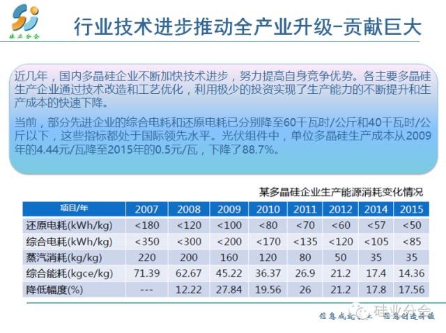 近幾年,國內(nèi)多晶硅企業(yè)不斷加快技術(shù)進(jìn)步,努力提高自身競爭優(yōu)勢。各主要多晶硅生產(chǎn)企業(yè)通過技術(shù)改造和工藝優(yōu)化,利用極少的投資實(shí)現(xiàn)了生產(chǎn)能力的不斷提升和生產(chǎn)成本的快速下降。截至2016年上半年,全行業(yè)平均綜合電耗已由2009年的180千瓦時(shí)/公斤降至80千瓦時(shí)/公斤以下,還原電耗由120千瓦時(shí)/公斤降至60千瓦時(shí)/公斤以下。部分先進(jìn)企業(yè)的綜合電耗和還原電耗已分別降至60千瓦時(shí)/公斤和40千瓦時(shí)/公斤以下,這些指標(biāo)都處于國際領(lǐng)先水平。光伏組件中單位多晶硅生產(chǎn)成本從2009年的4.44元/瓦降至2015年的0.5元/瓦,下降了88.7%。多晶硅環(huán)節(jié)占電站總成本的比例也明顯減少,2009年多晶硅占組件成本的29.7%,占電站總成本的17.8%。2015年多晶硅占組件的成本只有18.3%,占電站總成本的8.5%。