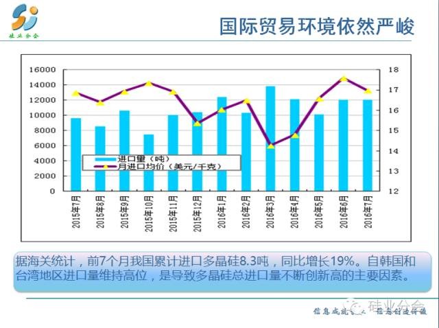 就多晶硅而言,今年以來,受國內(nèi)外光伏市場補(bǔ)貼到期、大面積搶裝引發(fā)需求井噴、特別是中國市場上半年裝機(jī)量超過20GW的影響,2016年國內(nèi)多晶硅行業(yè)總體呈現(xiàn)良好的運(yùn)行態(tài)勢,具體概括為以下幾點(diǎn):一是多晶硅價(jià)格理性回歸;二是多晶硅供應(yīng)能力大幅提升;三是行業(yè)技術(shù)進(jìn)步推動(dòng)產(chǎn)業(yè)鏈升級;四是國際貿(mào)易糾紛依舊嚴(yán)峻。