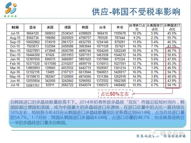 第一,自韓國進(jìn)口的多晶硅數(shù)量居高不下。2014年初商務(wù)部終裁公布后的第4個(gè)月,韓國即超過德國和美國,成為中國最大的多晶硅進(jìn)口來源地,在進(jìn)口總量中的占比一直持續(xù)在50%左右的高位,特別是今年4月份從韓國進(jìn)口多晶硅數(shù)量創(chuàng)歷史新高達(dá)到6614噸,占當(dāng)月總進(jìn)口量的54.7%。1-7月份,我國從韓國進(jìn)口多晶硅4.04萬噸,占進(jìn)口總量的48.7%,也會(huì)就是說將近一半的多晶硅進(jìn)口量來自韓國;