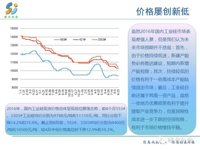 對工業(yè)硅方面,在國內(nèi)外需求增速放緩、供應(yīng)持續(xù)增加的背景下,2016年國內(nèi)工業(yè)硅行業(yè)總體呈現(xiàn)低迷的運(yùn)行態(tài)勢,具體表現(xiàn)為:一是工業(yè)硅價(jià)格屢創(chuàng)新低;二是工業(yè)硅產(chǎn)量再創(chuàng)新高;三是內(nèi)需有新亮點(diǎn),出口萎縮;四是產(chǎn)業(yè)布局調(diào)整陷入僵持階段。