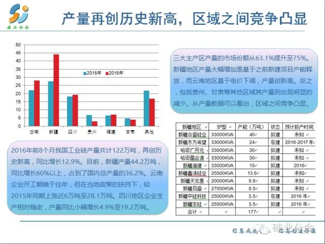 據(jù)硅業(yè)分會(huì)統(tǒng)計(jì),2016年前8個(gè)月我國工業(yè)硅產(chǎn)量共計(jì)122萬噸,再創(chuàng)歷史新高,同比增長12.9%。目前,新疆是工業(yè)硅產(chǎn)量最大的地區(qū),前8個(gè)月產(chǎn)量為44.2萬噸,同比增長60%以上,占到了國內(nèi)總產(chǎn)量的36.2%。云南企業(yè)開工期晚于往年,但在當(dāng)?shù)卣叩姆龀窒拢颇锨?個(gè)月產(chǎn)量較2015年同期增加近6萬噸,達(dá)到28.1萬噸。四川地區(qū)企業(yè)生產(chǎn)相對穩(wěn)定,產(chǎn)量同比小幅增長4.9%至19.2萬噸。