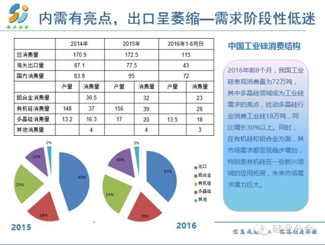 據(jù)硅業(yè)分會(huì)估計(jì),2016年前8個(gè)月,我國工業(yè)硅表觀消費(fèi)量為77萬噸,其中多晶硅領(lǐng)域成為工業(yè)硅需求的亮點(diǎn)。今年上半年,受益于太陽能光伏終端市場搶裝,國內(nèi)多晶硅進(jìn)入供不應(yīng)求的狀態(tài),一線企業(yè)滿載運(yùn)行,部分停產(chǎn)檢修企業(yè)恢復(fù)生產(chǎn)。硅業(yè)分會(huì)統(tǒng)計(jì),2016年前8個(gè)月國內(nèi)多晶硅產(chǎn)量為13.5萬噸,拉動(dòng)多晶硅行業(yè)消費(fèi)工業(yè)硅量18萬噸,同比大幅增長30%以上。同時(shí),在有機(jī)硅和鋁合金方面,其市場需求都是呈現(xiàn)穩(wěn)步增加,特別是有機(jī)硅在一些新興領(lǐng)域的應(yīng)用拓展,未來市場需求潛力巨大。