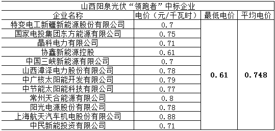 表五山西陽泉光伏領跑者中標企業(yè)及電價