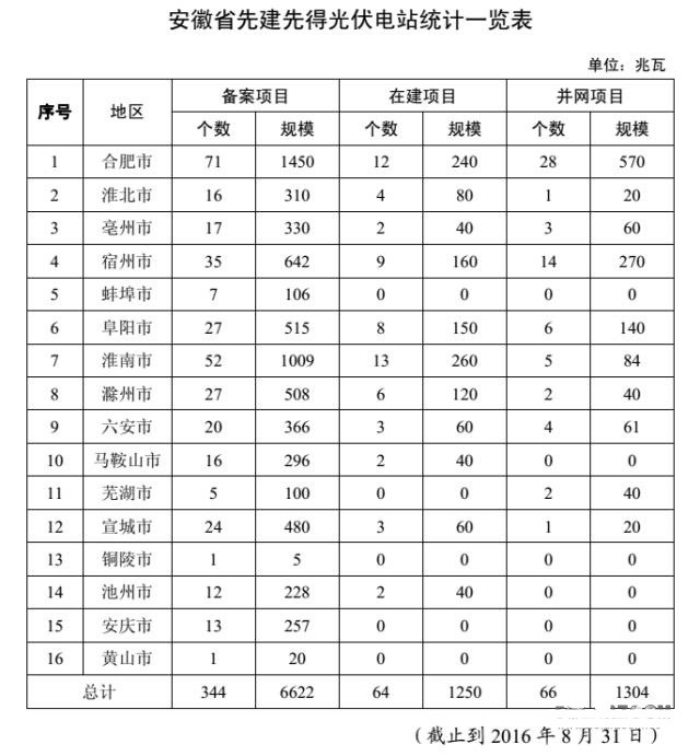 初步統(tǒng)計(jì),截止 2016 年 8 月底,全省已備案 20 兆瓦及以下 先建先得光伏電站項(xiàng)目 344 個(gè),裝機(jī) 6622 兆瓦。其中,并網(wǎng)項(xiàng) 目 66 個(gè),裝機(jī) 1304 兆瓦,占全省并網(wǎng)光伏電站裝機(jī) 54%;在建項(xiàng)目 64 個(gè)、裝機(jī) 1250 兆瓦。并網(wǎng)項(xiàng)目中,有 53 個(gè)項(xiàng)目、裝機(jī) 1024 兆瓦確認(rèn)了光伏電站規(guī)模指標(biāo),約占已建成并網(wǎng)裝機(jī)規(guī)模的 80%。