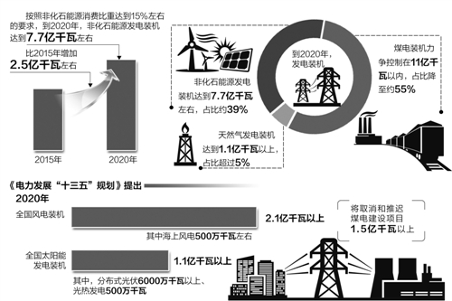 在電源結(jié)構(gòu)方面。按照非化石能源消費(fèi)比重達(dá)到15%左右的要求,到2020年,非化石能源發(fā)電裝機(jī)達(dá)到7.7億千瓦左右,比2015年增加2.5億千瓦左右,占比約39%,提高4個(gè)百分點(diǎn),發(fā)電量占比提高到31%;天然氣發(fā)電裝機(jī)增加5000萬千瓦,達(dá)到1.1億千瓦以上,占比超過5%;煤電裝機(jī)力爭(zhēng)控制在11億千瓦以內(nèi),占比降至約55%。電源結(jié)構(gòu)得到進(jìn)一步優(yōu)化。