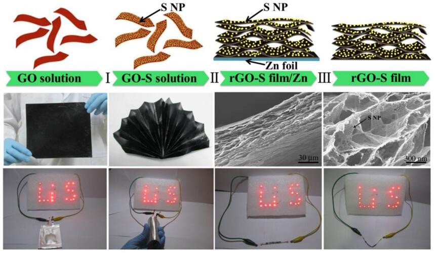 近期,南開大學牛志強研究團隊結合原位復合和金屬還原自組裝的方法制備了自支撐柔性石墨烯/硫納米復合薄膜,復合物薄膜中石墨烯具有連續(xù)的網絡狀結構,硫均勻分散在石墨烯的表面,石墨烯連續(xù)的網絡狀結構不僅為離子和電子傳輸提供了有效的途徑,還可以有效吸附多硫化物并抑制其溶解。
