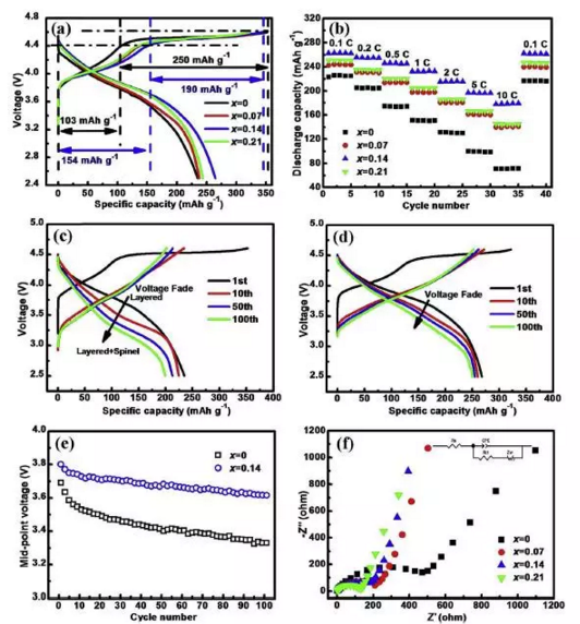 哈爾濱工業(yè)大學(xué)的Quanxin Ma等人針對(duì)富鋰材料這些問(wèn)題進(jìn)行了摻雜改性實(shí)驗(yàn)。Quanxin Ma通過(guò)向富鋰材料中加入Se元素合成了Li1.2[Mn0.7Ni0.2Co0.1]0.8_xSexO2,實(shí)驗(yàn)表明該材料具有良好的倍率性能,在10C的倍率下,比容量可達(dá)178mAh/g,并且Se元素?fù)诫s很好的抑制了富鋰材料的電壓衰降,循環(huán)100次,中值電壓衰降僅為5%。
