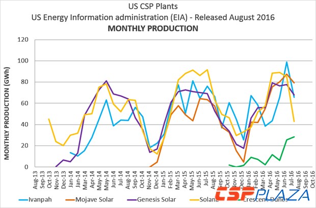 單純地從實(shí)際發(fā)電量與設(shè)計(jì)發(fā)電量的對(duì)比來(lái)看,槽式無(wú)儲(chǔ)熱電站的表現(xiàn)最佳,Genesis Solar在2015年全年的發(fā)電量達(dá)到621454MWh,達(dá)設(shè)計(jì)年發(fā)電量的107%;Solana電站在2015年全年的發(fā)電量達(dá)到718843MWh,達(dá)設(shè)計(jì)年發(fā)電量的76%;Ivanpah電站2015年度總發(fā)電量達(dá)到670467MWh,達(dá)設(shè)計(jì)年發(fā)電量的62%。這三大電站的投運(yùn)時(shí)間相近,排除各自需要的學(xué)習(xí)過(guò)渡期的因素影響,槽式無(wú)儲(chǔ)熱電站看起來(lái)更易達(dá)到設(shè)計(jì)發(fā)電目標(biāo)。