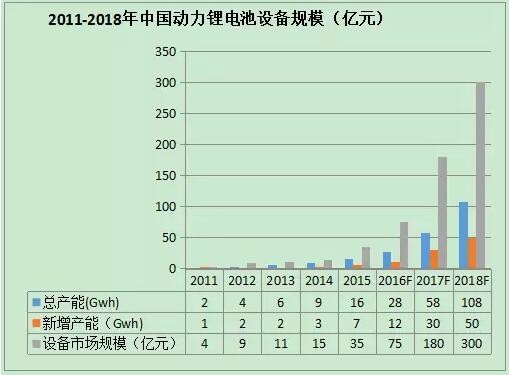 根據(jù)預(yù)測(cè),未來(lái)三年將是動(dòng)力鋰電池產(chǎn)能擴(kuò)張高峰期,預(yù)計(jì)2016-2018年三年的新增產(chǎn)能將達(dá)到92Gwh,對(duì)應(yīng)的設(shè)備市場(chǎng)規(guī)模按照平均1Gwh對(duì)應(yīng)6億元設(shè)備需求計(jì)算,三年的設(shè)備總規(guī)模將達(dá)到552億元,2018年中國(guó)動(dòng)力電池設(shè)備需求規(guī)模將達(dá)到300億元。