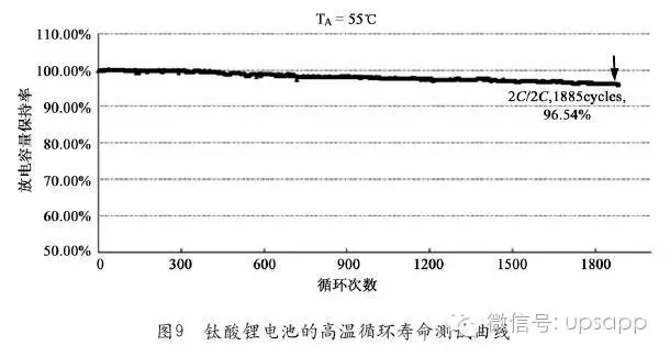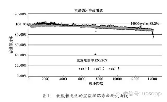 長(zhǎng)壽命。鈦酸鋰單體電芯的循環(huán)壽命長(zhǎng)達(dá)2.5萬(wàn)次以上,圖9和圖10分別給出了鈦酸鋰電池高溫循環(huán)壽命測(cè)試曲線和室溫循環(huán)壽命測(cè)試曲線;