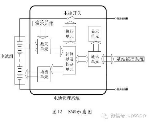 電池管理系統(tǒng)(Battery Management System,BMS)由監(jiān)測(cè)、保護(hù)電路、電氣、通訊接口、熱管理和電池組反接保護(hù)裝置等組成,是電池保護(hù)和管理的核心組成部分,不僅要保證電池安全可靠的使用,而且要充分發(fā)揮電池的性能和延長(zhǎng)使用壽命,作為通信用的后備能源,BMS在開(kāi)關(guān)電源和電池之間起到一個(gè)重要橋梁作用。對(duì)BMS的要求必須符合通信電源供電系統(tǒng)的要求,所以BMS的安全管理模式對(duì)電池的安全性至關(guān)重要。BMS主要包括數(shù)據(jù)采集單元、計(jì)算以及控制單元、均衡單元、控制執(zhí)行單元和通訊單元等。圖13為BMS示意圖。