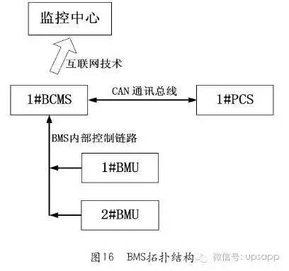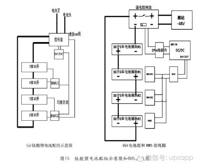 例如,某通信基站使用48V/300Ah鈦酸鋰電池(實(shí)物圖見(jiàn)圖14),每組電池由22只300Ah的電池模塊串聯(lián)組成,其中300Ah的電池是由10個(gè)單電芯容量為30Ah的電芯并聯(lián)組成,22節(jié)300Ah的電池模塊分別有2個(gè)6串和2個(gè)5串模組串聯(lián)組成一個(gè)48V/300AH的電池組,整組電池由BMS系統(tǒng)控制,由一個(gè)BCMS(BatteryClusterManagementSystem,主控電池管理系統(tǒng))負(fù)責(zé)管理一個(gè)電池組中的全部BMU(BatteryManagementUnit,電池組管理單元),同時(shí)具備電池組的電流采集,總電壓采集,漏電檢測(cè)功能,并在電池組狀態(tài)發(fā)生異常時(shí)驅(qū)動(dòng)斷開(kāi)高壓功率接觸器,使電池組退出運(yùn)行,保障電池使用安全。兩個(gè)BMU,每個(gè)BMU負(fù)責(zé)管理12串單體電池模塊。具有電池電壓采集,多點(diǎn)溫度采集,各種保護(hù)和電池組均衡控制等功能。鈦酸鋰電池配組示意圖和BMS接線如圖15所示。