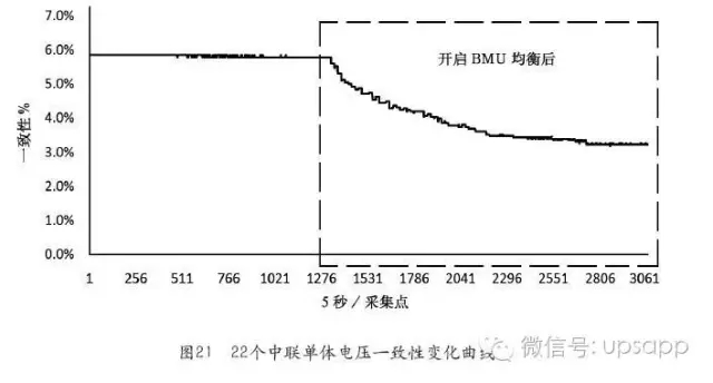 從圖21可以看出300Ah電池組22模組在開(kāi)啟BMU均衡的時(shí)候,電壓一致性從分散的狀態(tài)逐漸趨于集中,表明單體均衡功能有效。