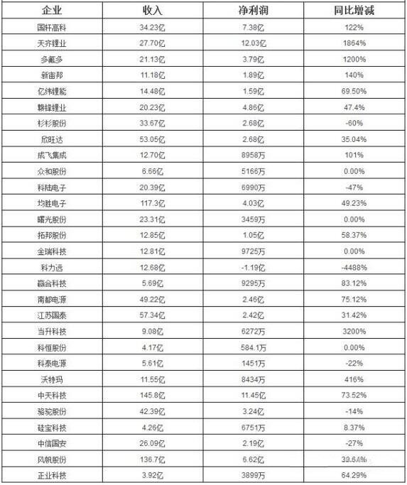 2016年29家動(dòng)力電池上市公司1-9月收入一覽表