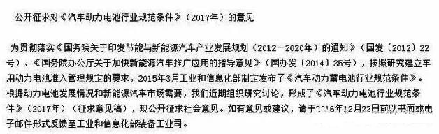 11月22日,工信部公布了最新的《汽車動(dòng)力電池行業(yè)規(guī)范條件》(2017年)征求意見稿,該征求意見稿將鋰離子動(dòng)力電池單體企業(yè)產(chǎn)能的門檻提高至過(guò)去的40倍。動(dòng)力電池產(chǎn)能的要求提高后,電池、材料與設(shè)備行業(yè)龍頭企業(yè)將大大受益。但是,對(duì)于規(guī)模較小,產(chǎn)能無(wú)法達(dá)標(biāo)的小型動(dòng)力電池制造商來(lái)說(shuō)無(wú)疑是場(chǎng)災(zāi)難。